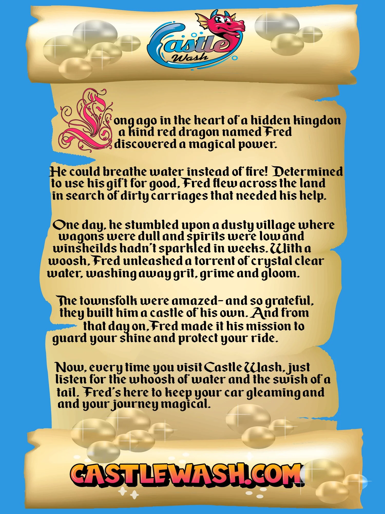 At Castle Wash, our legendary dragon Fred doesn't breathe fire—he breathes water! His magical mission? To blast away dirt and grime and keep your ride shining bright. Just like Fred, we believe that a little imagination and a good wash can go a long way.